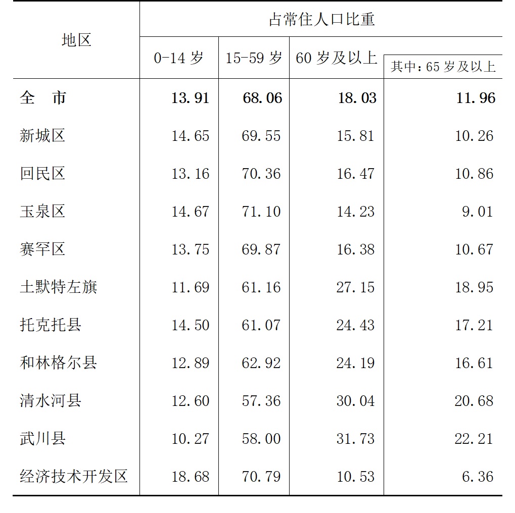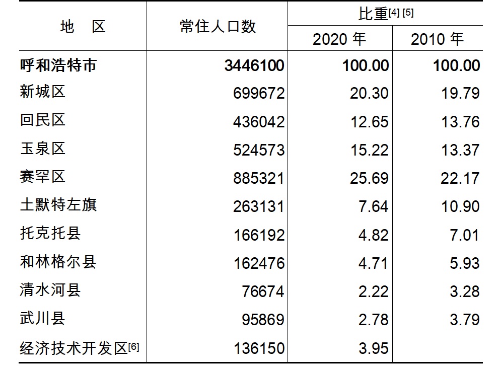 注:因管理体制改革,原经济技术开发区下辖金川开发区划归土左旗、玉泉区,该区域具体人口数据另行调整公布。