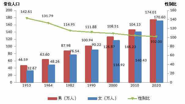全市常住人口[2]中,男性人口为1740118人,占50.50%;女性人口为1705982人,占49.50%。常住人口性别比(以女性为100,男性对女性的比例)为102.00,与2010年第六次全国人口普查的104.13相比下降2.13。