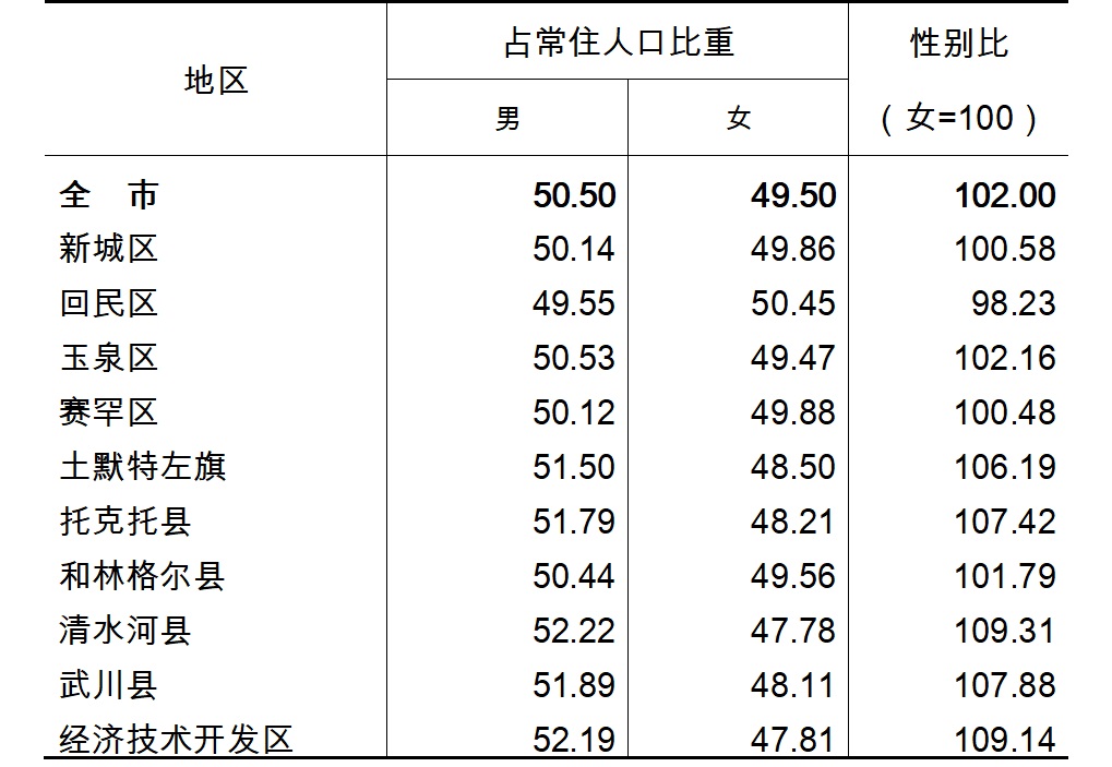 根据第七次全国人口普查结果,现将2020年11月1日零时我市10个市辖区、旗县、开发区(以下简称旗县区)常住人口性别构成情况公布如下: