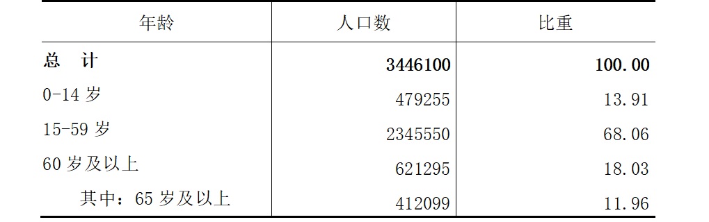 全市常住人口[2]中,0-14岁[3]人口为479255人,占13.91%;15-59岁人口为2345550人,占68.06%;60岁及以上人口为621295人,占18.03%,其中65岁及以上人口为412099人,占11.96%。与2010年第六次全国人口普查相比,0-14岁人口的比重上升0.02个百分点,15-59岁人口的比重下降6.67个百分点,60岁及以上人口的比重上升6.65个百分点,65岁及以上人口的比重上升4.32个百分点。