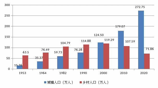全市常住人口[3]中,居住在城镇的人口为2727517人,占79.15%;居住在乡村的人口为718583人,占20.85%。与2010年第六次全国人口普查相比,城镇人口增加936835人,乡村人口减少357350人,城镇人口比重上升了16.68个百分点。