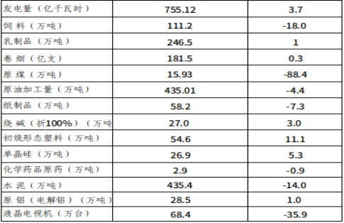 从主要工业产品产量看,发电量755.12亿千瓦时,比上年增长3.7%;饲料111.20万吨,下降18.0%;乳制品246.54万吨,增长1.0%;卷烟181.50亿支,增长0.3%;原油加工量435.01万吨,下降4.4%;烧碱(折纯)26.96万吨,增长3.0%;水泥435.44万吨,下降14.0%;单晶硅26.89万吨,增长5.3%;原铝(电解铝)28.50万吨,增长1.0%。