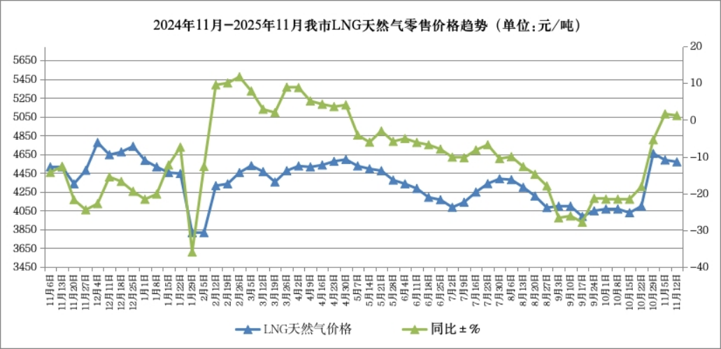 呼和浩特市价格认证监测中心对市场监测数据显示,本周我市LNG天然气零售价格为4570元/吨,比上周下降20元/吨,降幅0.44%,同比上涨1.20%。