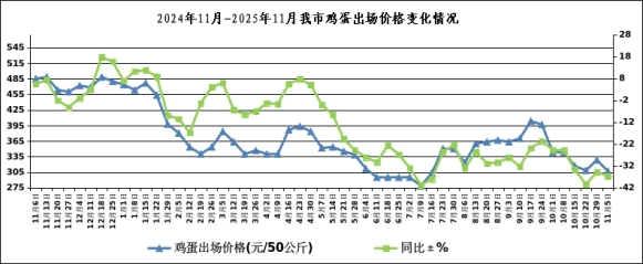 本周我市鸡蛋出场价格为306.67元/50公斤(3.07元/斤),比上周下降6.60%,同比下降36.77%。