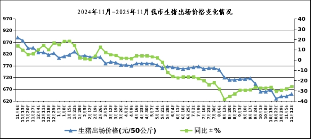 本周我市生猪出场价格为650.00元/50公斤(6.50元/斤),比上周上涨1.56%,同比下降25.86%,猪粮比5.70:1。