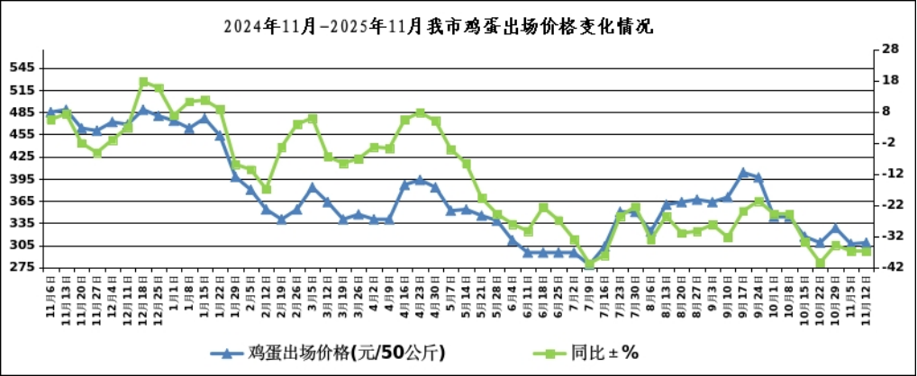 本周我市鸡蛋出场价格为308.33元/50公斤(3.08元/斤),比上周上涨0.54%,同比下降36.86%。