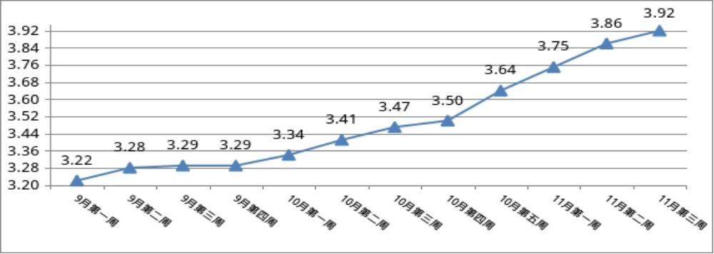 鸡蛋周平均零售价格为4.01元/斤,比上周上涨2.82%,猪肉精瘦肉、肋条、牛肉、羊肉(去骨)、羊肉(带骨)、鸡肉周平均零售价格分别为15.04元/斤、11.06元/斤、37.36元/斤、39.14元/斤、29.11元/斤、11.79元/斤,与上周持平。
