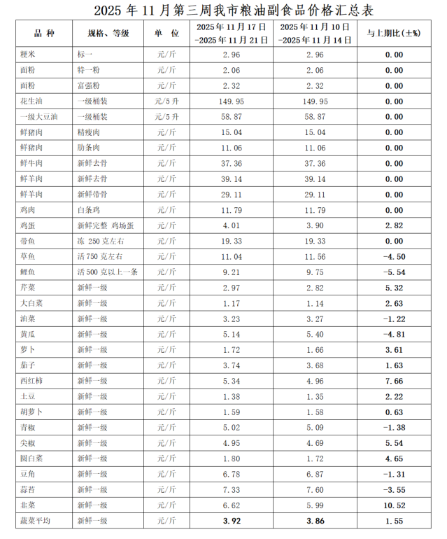 粳米、特一粉、富强粉周平均零售价格分别为2.96元/斤、2.06元/斤、2.32元/斤,与上周持平。