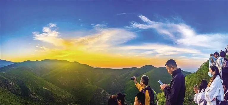 市区内,青山观日成为市民踏青的首选。走上大青山健身步道,沿着台阶一路前行,站在观景平台可将呼和浩特市区全貌尽收眼底,山脚下中式茶馆云集的水磨村非常适合和亲友小聚。市民杜峻和家人朋友连续两天徒步大青山健身步道,打卡“日出徒步+农家宴”的休闲旅程。