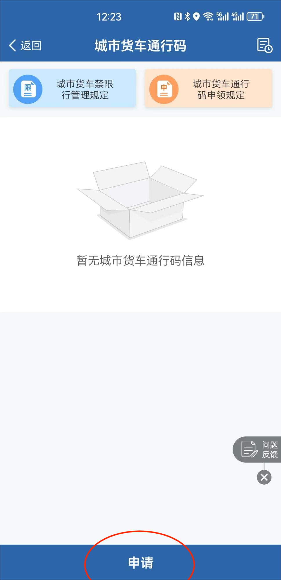 个人用户登录“12123"APP,点击“更多”—进入通行码首页面,点击【城市货车通行码申领】,按钮进入申请流程。