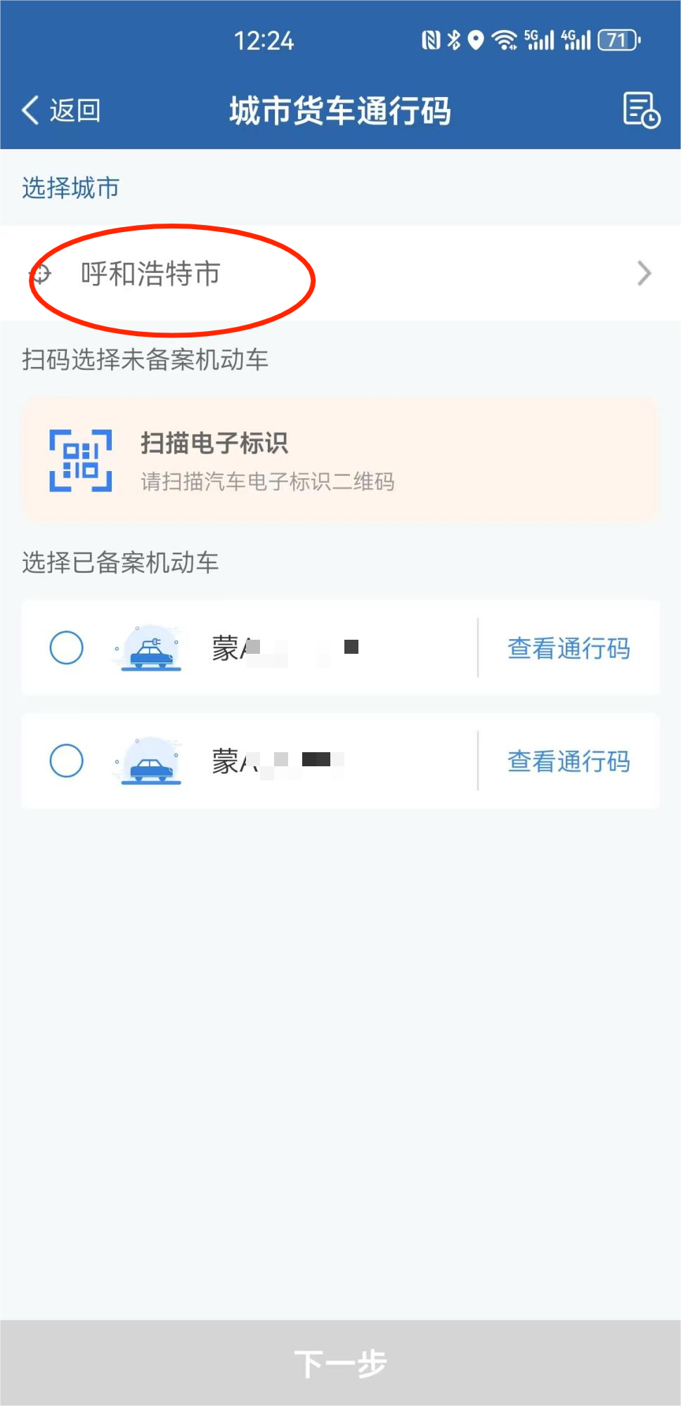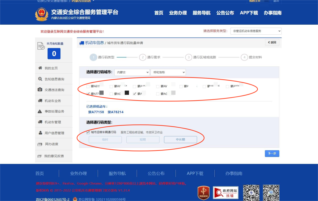 第一步选择机动车和城市。选择通行码申领城市(默认用户注册地)后,继续在已备案的机动车列表中选择申领通行码的机动车。点击“下一步”进入第二步。