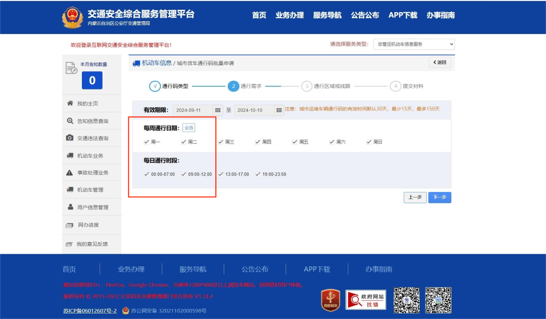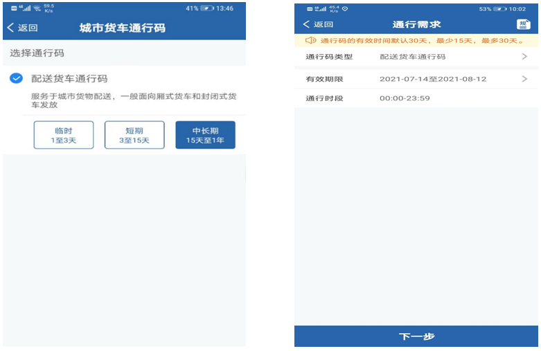 第二步录入通行时段需求。用户选择申领的通行码类型后,根据实际通行情况,录入通行时段需求。点击“下一步”进入第三步。