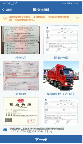 第四步上传通行码材料。用户按要求上传通行码所需材料的影像资料。所有材料均上传完毕后,勾选“我已确认上诉材料有效期在通行码有效期内”。点击“下一步”进入第五步。
