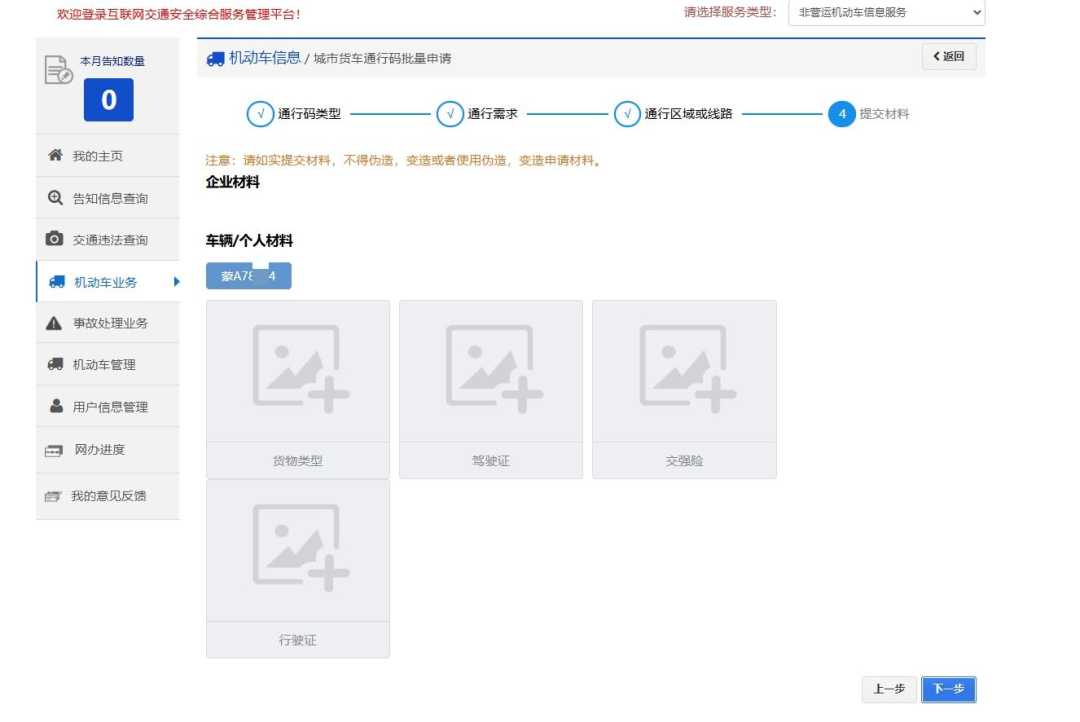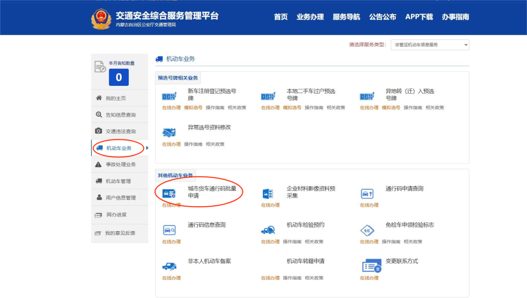 三、点击“机动车业务”,选择“城市货车通行码批量申请“。