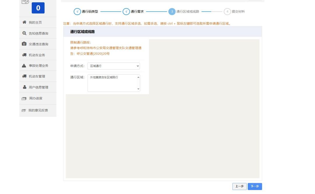 第三步选择通行线路(区域)。申请方式选择“区域通行”,用户直接在通行区域列表中选择一个区域作为通行区域。点击“下一步”进入第四步。