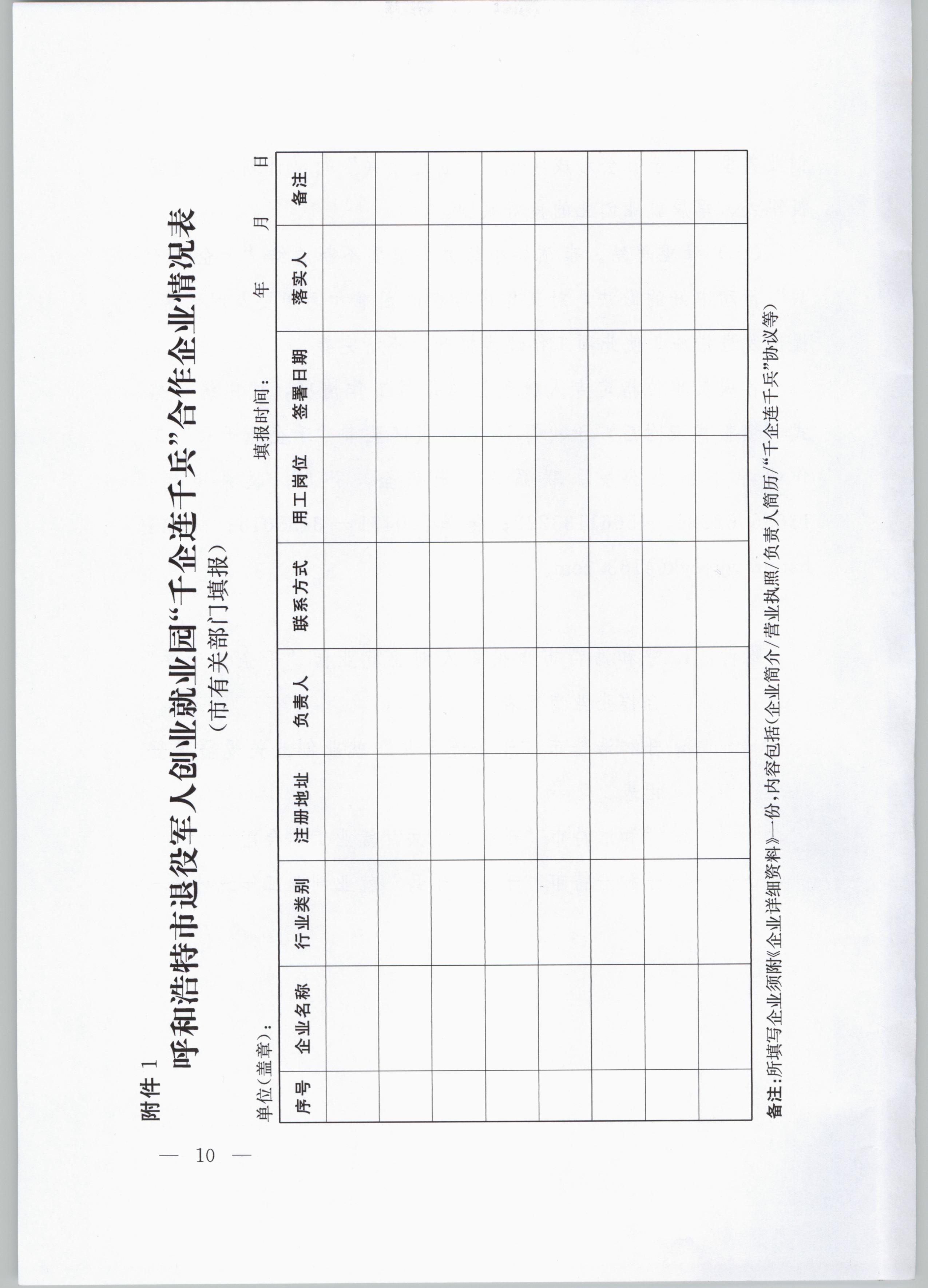 附件:1.呼和浩特市退役军人创业就业园“千企连千兵”合作企业情况表