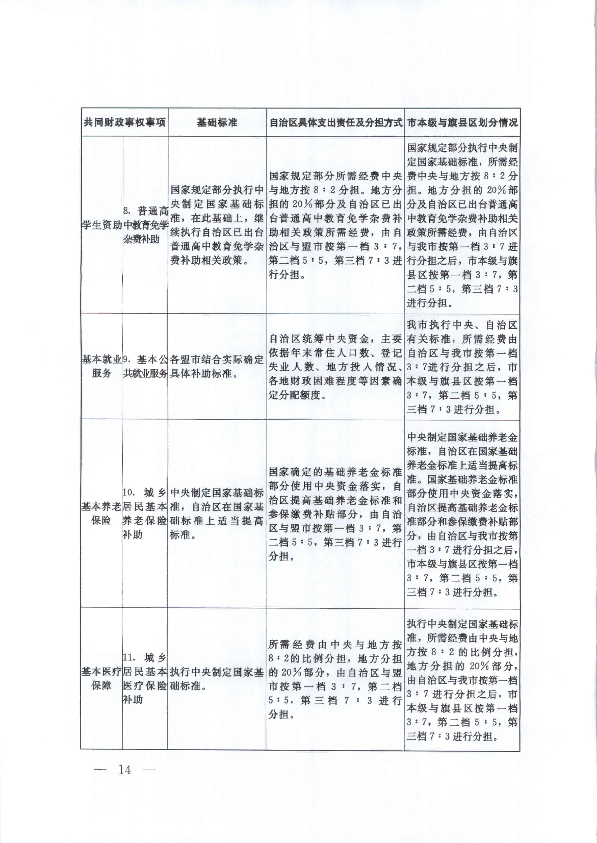 根据我市及旗县区经济社会发展实际情况,对中央、自治区已明确的八大类18项中的义务教育公用经费保障、家庭经济困难学生生活补助、贫困地区学生营养膳食补助、中等职业教育国家助学金、中等职业教育免学费补助、普通高中教育国家助学金、普通高中教育免学杂费补助、基本公共就业服务、城乡居民基本养老保险补助、城乡居民基本医疗保险补助、医疗救助、基本公共卫生服务、计划生育扶助保障、困难群众救助、残疾人服务15个事项地方应负担部分,统一实行市本级与旗县区分档分担办法。第一档包括托克托县、赛罕区、新城区、和林格尔县4个地区,市本级分担30%,各地区分担70%;第二档包括土默特左旗、回民区、玉泉区3个地区,市本级分担50%,各地区分担50%;第三档包括清水河县和武川县2个地区,市本级分担70%,各地区分担30%。此前全市出台与此分档分担比例不一致的全部按此执行。同时,根据各地区经济社会发展和财力变化情况,上述分档分担比例由市财政适时进行动态调整。其余3个事项按项目、按因素分担或按标准定额补助。具体事项明确如下: