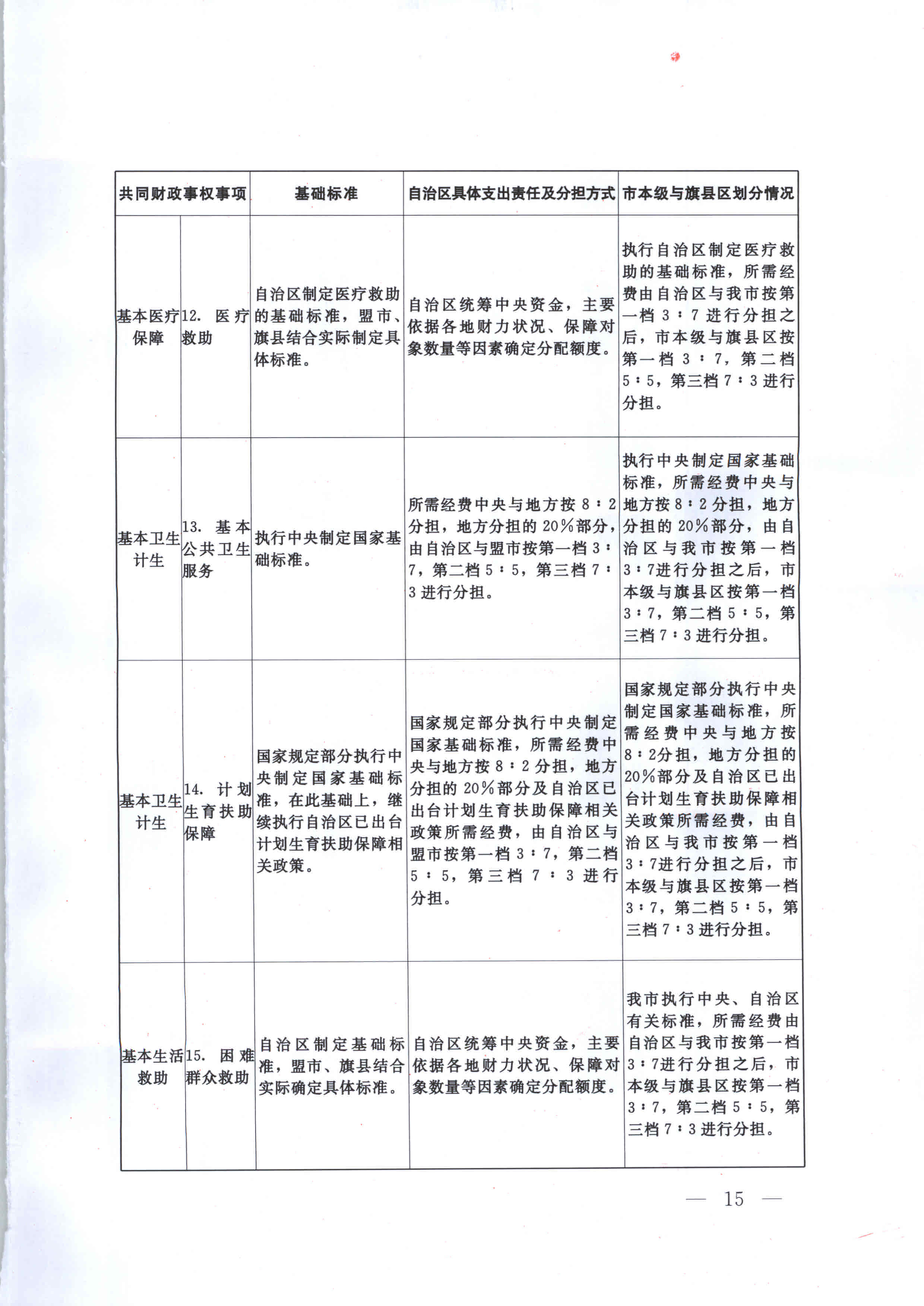 15.困难群众救助。我市执行中央、自治区有关标准,所需经费由自治区与我市按第一档3∶7进行分担之后,市本级与旗县区按第一档3∶7,第二档5∶5,第三档7∶3进行分担。