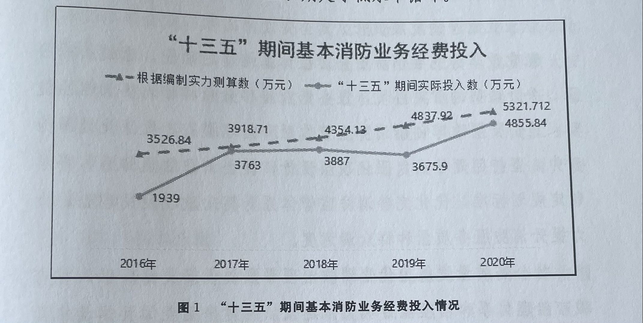 消防救援事业发展保障不足。根据“十三五”时期消防经费投入计划,全市基本消防业务经费保障在2016年(应达到标准测算数3526.84万元)的基础上逐年增长10%,但实际投入数未达标(见图1)。各旗县区消防经费保障不平衡,部分地区消防经费未达到标准的50%,导致消防队站、装备水平仍然滞后于城乡发展。专职消防队伍政策保障支撑不足,相关福利待遇未落实,建设经费投入不到位,队伍规模和建设质量长期处于低水平循环。