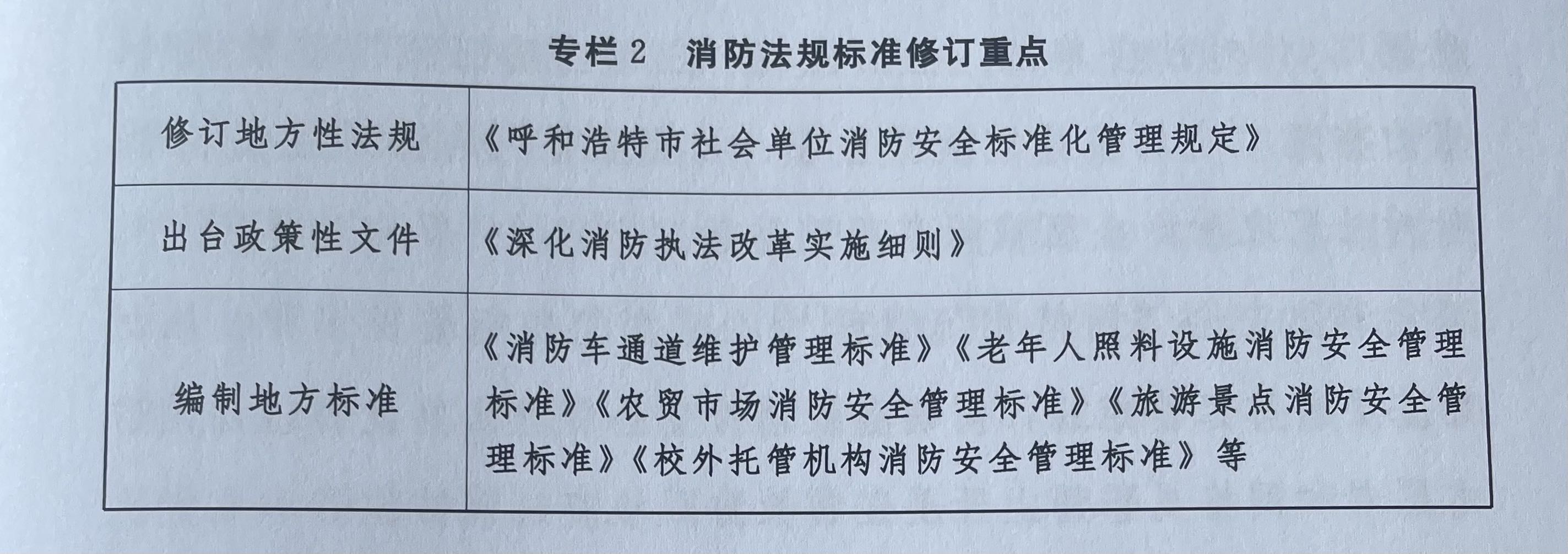 加强消防法制保障。结合消防机构改革转隶和消防执法改革,清理、修改、完善与消防救援事业发展不适应的地方规章、行政规范性文件;制定出台《深化消防执法改革实施细则》;持续推进行业消防安全标准化管理,相关部门联合制定出台行业消防安全管理规章,紧盯重点领域、重点行业,制定出台消防地方标准;加强新颁布实施消防法律法规的宣传贯彻工作,建立各级人大对“一法一条例”执法工作的监督评估机制,为推动消防工作高质量发展提供法律支撑和保障。