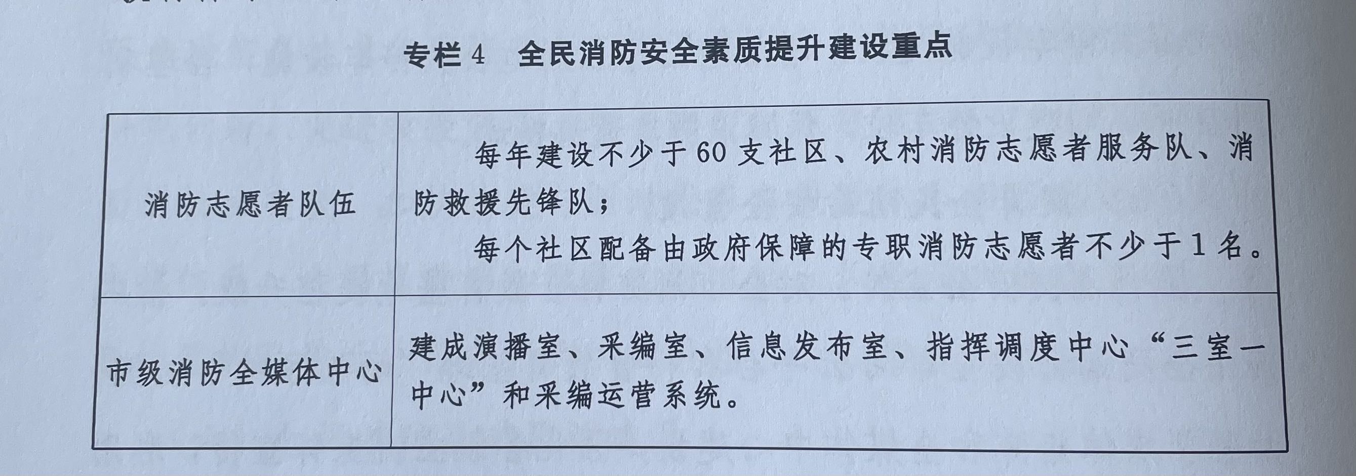 强化消防安全宣传。对全市消防科普教育基地提档升级。推广应用全民消防安全学习云平台和科普教育基地“场馆预约”功能。加强新媒体矩阵和全媒体中心建设,强化各级主流媒体宣传,利用地铁、公交车等公共交通工具为媒介扩大消防宣传覆盖面。加强公共场所、社区(村)消防宣传阵地建设,定期开展“敲门行动”“入户提醒”等活动,广泛宣传消防安全知识。加大优质消防题材宣传产品供给,在宣传的内容、题材、形式、手段上不断创新,针对不同场所类型、不同火灾原因、不同受众对象,创作主题鲜明、感染性强、通俗易懂的消防宣传警示教育片。持续壮大消防志愿者队伍,各地打造具有当地特色的消防志愿服务队伍。鼓励社会力量参与消防文化宣传,推动消防公益事业发展。