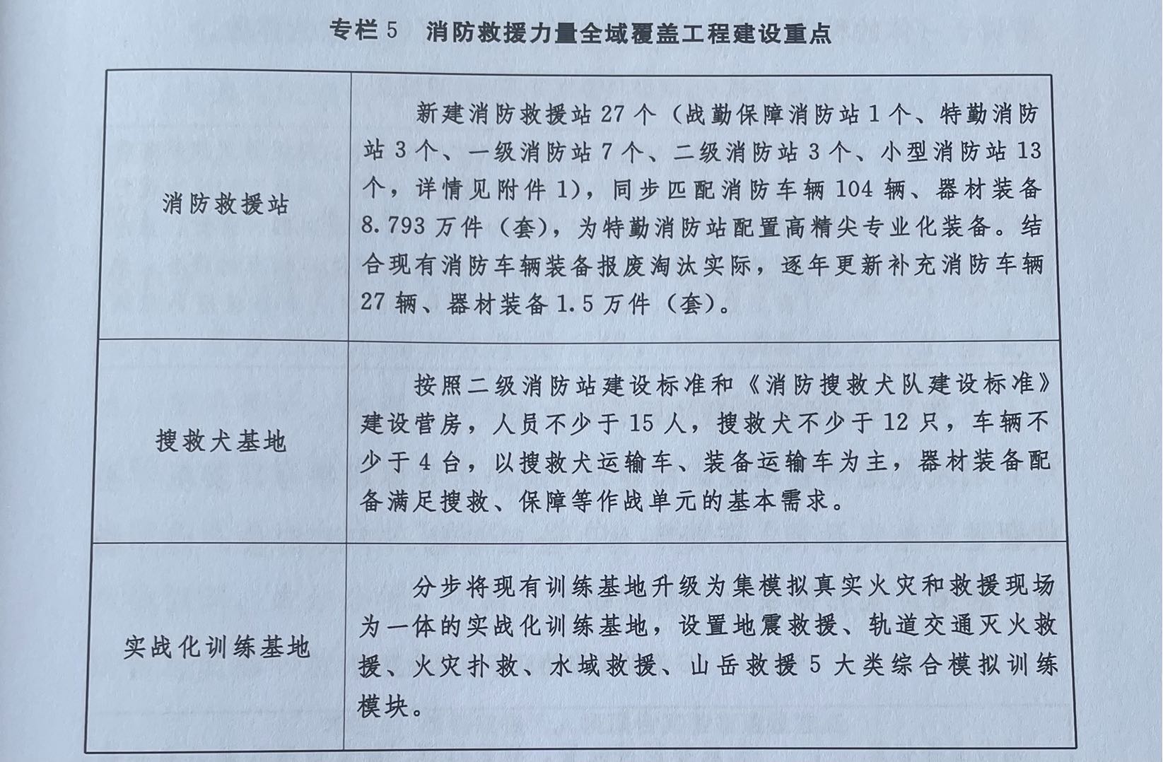 围绕应急救援实战需要,统筹典型灾害和全灾种、救援实训与跨区域应急救援等需要,按照“立足当前,谋划长远”原则建设消防救援站、搜救犬基地,升级实战化训练基地。加强车辆器材装备配备,逐步形成满足要求、配置科学、编成合理的消防力量全域覆盖体系。