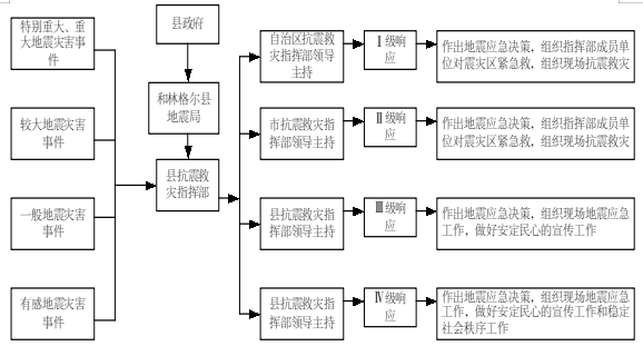 | 有感地震 | Ⅳ级 | 在市抗震救灾指挥部的支持下,由县抗震救灾指挥部领导灾区的地震应急工作 |