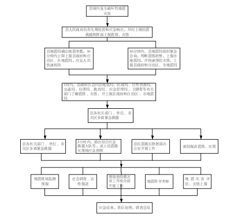 县人民政府负责先期处置和应急响应,在自治区、市抗震救灾指挥部的支持下,由县抗震救灾指挥部领导灾区的地震应急工作。