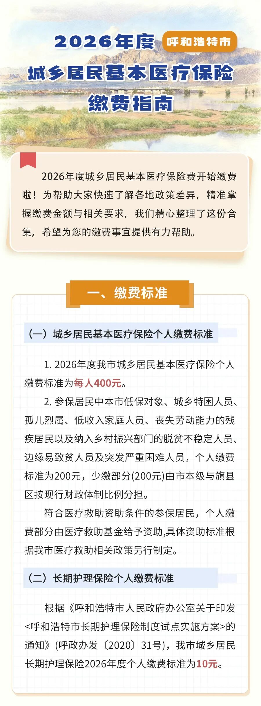 2026年度城乡居民基本医疗保险缴费指南:呼和浩特市