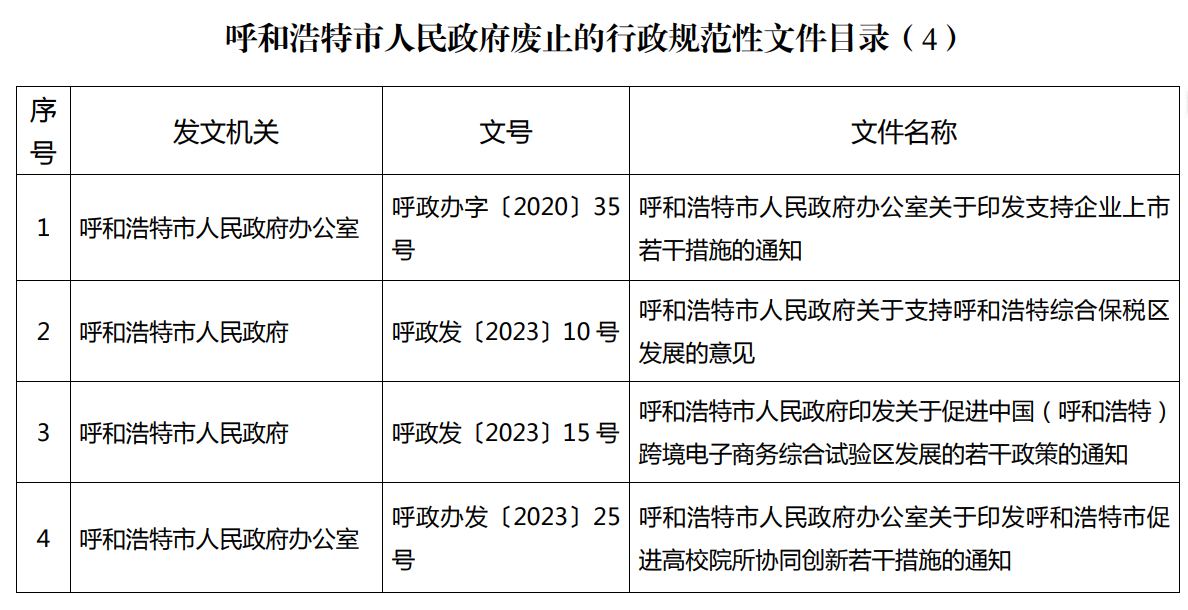 经呼和浩特市人民政府2025年第21次常务会议研究通过,现将《呼和浩特市人民政府废止的行政规范性文件目录》印发给你们,纳入目录的行政规范性文件自本通知印发之日起停止执行,不再作为行政管理的依据。请各地区、各部门结合当前工作实际,统筹做好政策衔接。